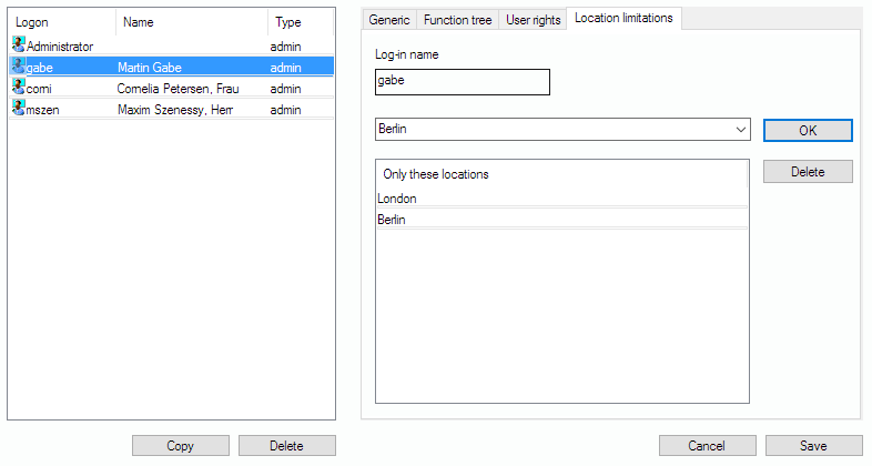 Under “Location limitations”, you can assign concrete viewing permissions for existing locations. If you add locations to this list, the user has explicit permission for those ONLY. You can use the drop-down field to choose an existing location, or you can just type in the location’s name. Afterwards you click “OK” in order to add it. You can delete an allowed location by highlighting it and clicking “Delete” afterwards.