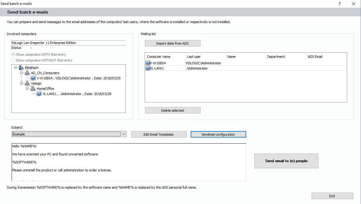 If you want to send e-mails to the last users of PCs in your list, you can use this function. After you created a list of PCs in “Software and Device List” and chose the tree result, you can select a branch in the result and click on “Send E-Mails”.