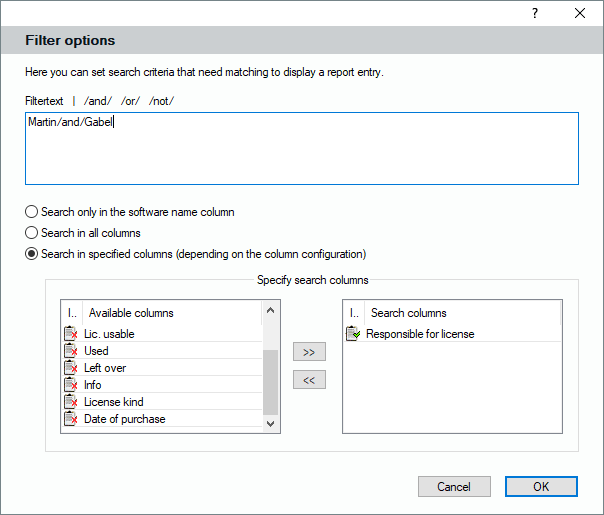 The advanced filters help to create very individual license balances that may focus on licenses of special responsible persons or any other kind. You can use any filter text you like and specify in what columns the search will take place, search only in software name, in all columns or in specified columns you can set in the list at the bottom.