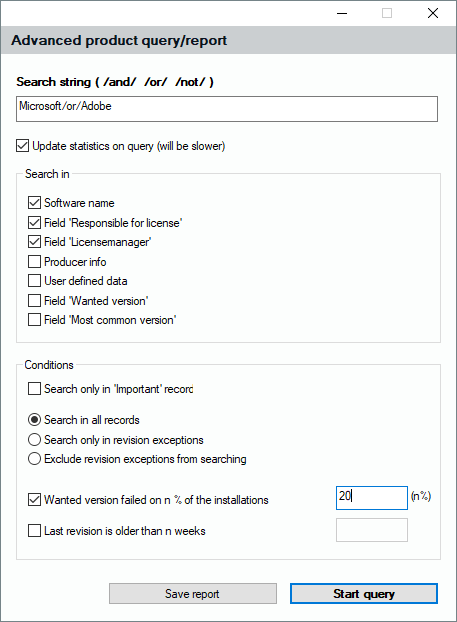 The following picture shows the dialog that helps you create an advanced query on the managed software products. You can enter a search string at the top which accepts the logical operators /and/ , /or/ and /not/ . You find a description of the possible options in the following sections.
