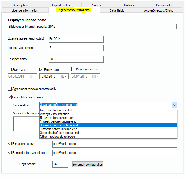 Here, you can specify facts about the agreement associated with this license record. You can deposit start date and optionally an expiry date. If further license fees need to be payed, you can set a date for this point of time as well. If an agreement renews itself, you can tell it here, also if, a cancellation is necessary. If this is the case, you can also set an e-mail reminder that tells you in time when you should consider cancelling. Please note, that e-mail functions only work if you have entered a working sendmail configuration.