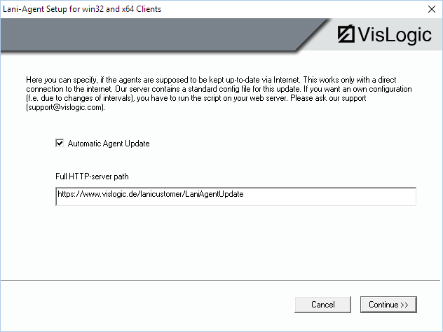 In order to establish the update mechanism you have to provide the https-path to an update script on a web server. The “update.cfg” has to be stored there. It contains all necessary details like the latest version number or e-mail configuration. You’ll find an sample “update.cfg” file in the folder “__LaniAgent_ManualSetupPackages”. The folder on the webserver must also contain the latest lani agent installer package (laniagent_win32_x64_v10000.exe). The update.cfg also specifies the expected MD5 sum of the installer package.