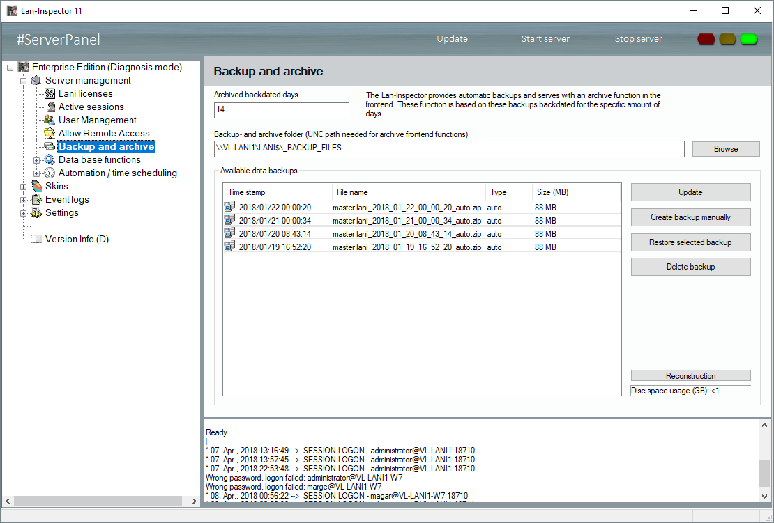The automated Lan-Inspector backup function also serves as a foundation for the direct archive access. The Lan-Inspector backup service creates automated backups for every day. By default, the number of backup days is 14. If your company needs to be revisable for 10 years, increase the value to 3650 days. The backup service creates archives of the last 14 / 3650 retroactive days. It will delete all the backups of days older then this value. If you look back into the past by using the archive function in the frontend, please note that you have read only access to the archives. Using the archives, you can directly restore a view upon each past day of the backup period.