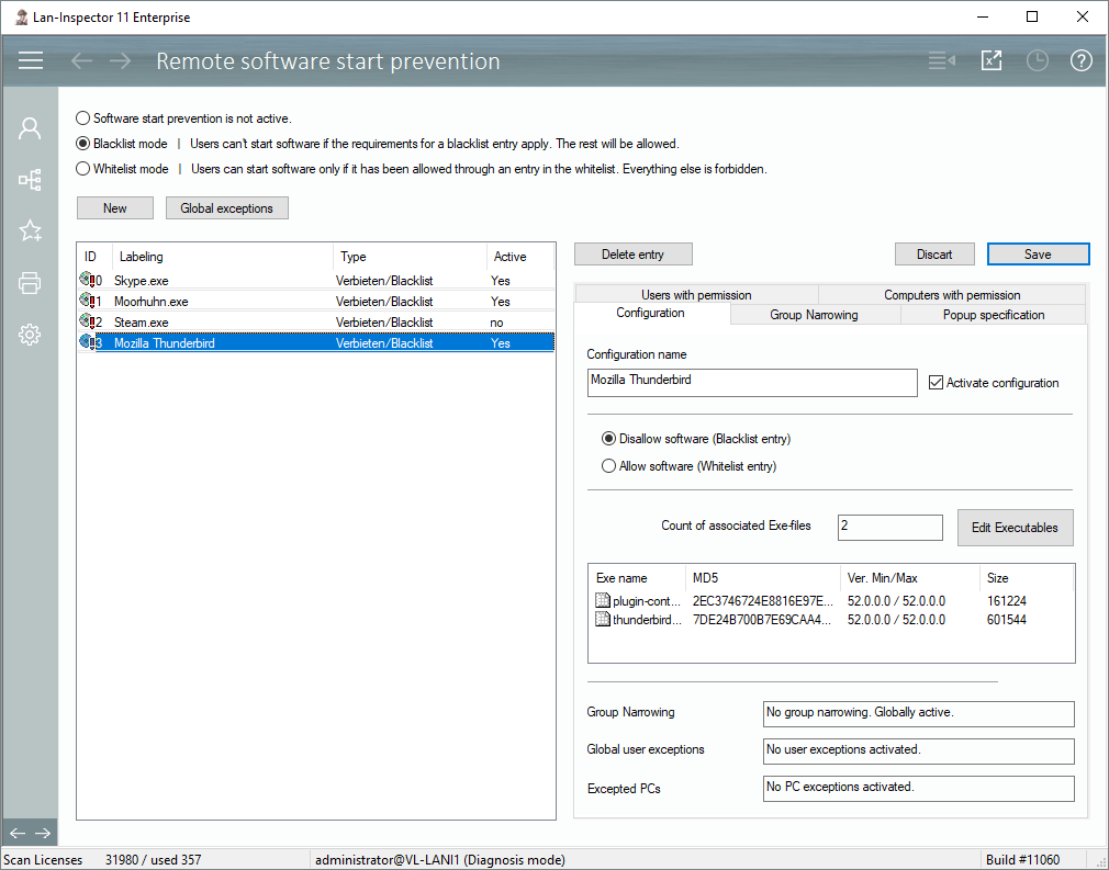 Blacklists and whitelists for full products are effective instruments of controlling the use of software in your network. These extensive functions are only available in the Professional Edition and the Enterprise Edition. The Lan-Inspector can stop the start of products on the client PCs effectively. This, for example, makes sense if people use portable versions of software they bring in with USB sticks.