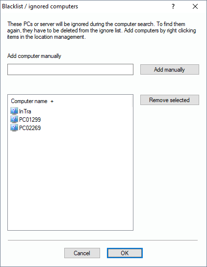 If you want to remove specified PCs or servers completely from views, scans, searches or queries, you can put them into the list of ignored computers. You can add the devices here in the dialog by manually typing in the name and click on “Add manually”.