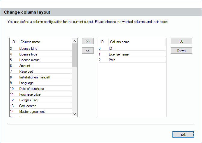 The results of your queries, which is a list of license records, will be displayed on the right side of the license pool. As almost every list in the Lan-Inspector, this list can be pushed to Excel by clicking the Excel button in the top bar. You might want to add additional information from the records to that list by adding columns. Select the columns you want and click them to the right by using “>>”. To remove a column, select it and click on “<<”.