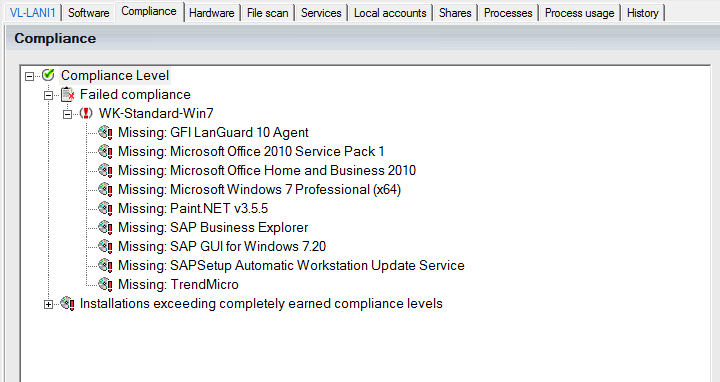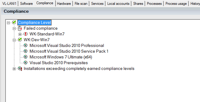 To receive a green check mark in the main branch, the computer needs to pass all compliance tests and no software is allowed to be installed exceeding the wanted list of products. The compliance tab will not be displayed if you haven’t defined any compliance levels.