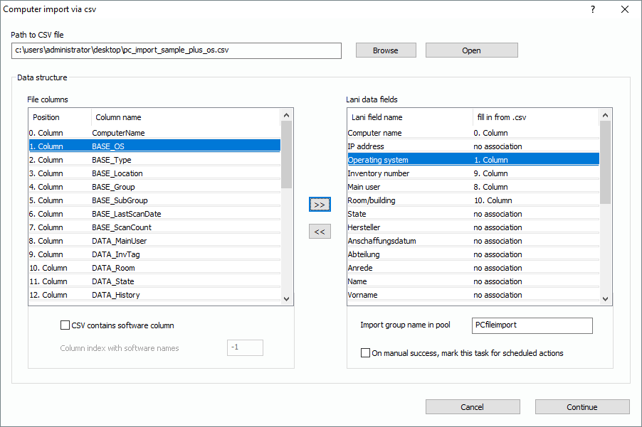 The names for operating systems underlie a standard in the Lan-Inspector, so it maybe that the names of operating systems in the csv won’t match the standards and will therefore not be recognized. Instead of “Microsoft Windows 8.1 Professional“, you might have “MS Windows 8.1 pro“ in your file. In the picture you see that the field “Operating System“ has an association now.