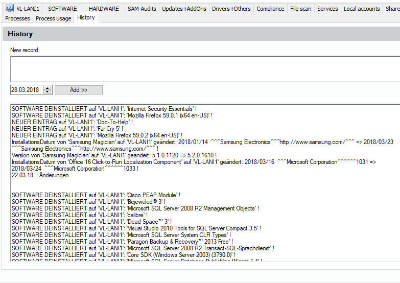 The history of an object saves information about events. As you can see in the picture, the Lan-Inspector can log changes in the software or hardware configuration.