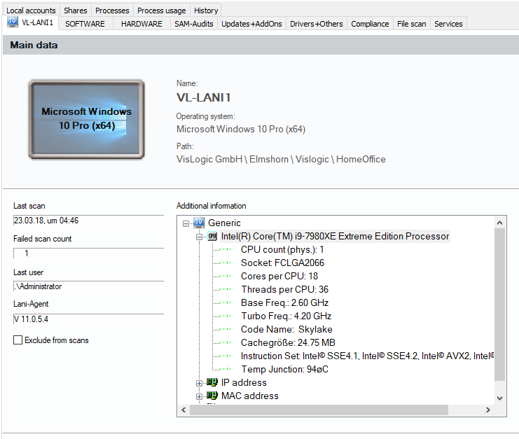 You will find all the significant information regarding computer management on this overview page: OS, CPU-Specs, IP and MAC address and the Bios serial number as well as information about the last scan and the last user. This tab also offers an option to explicitly exclude this PC from further scans.