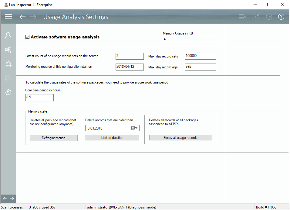 This GUI includes all miscellaneous settings like general activation of the function. It displays how much memory is consumed by the day sets of the computers. You can delete record sets by date, delete them all, or define their maximum age they will expire at. If you “Defrag” the record sets, the records will be recalculated to remove old information that may have been valid in prior configurations.
