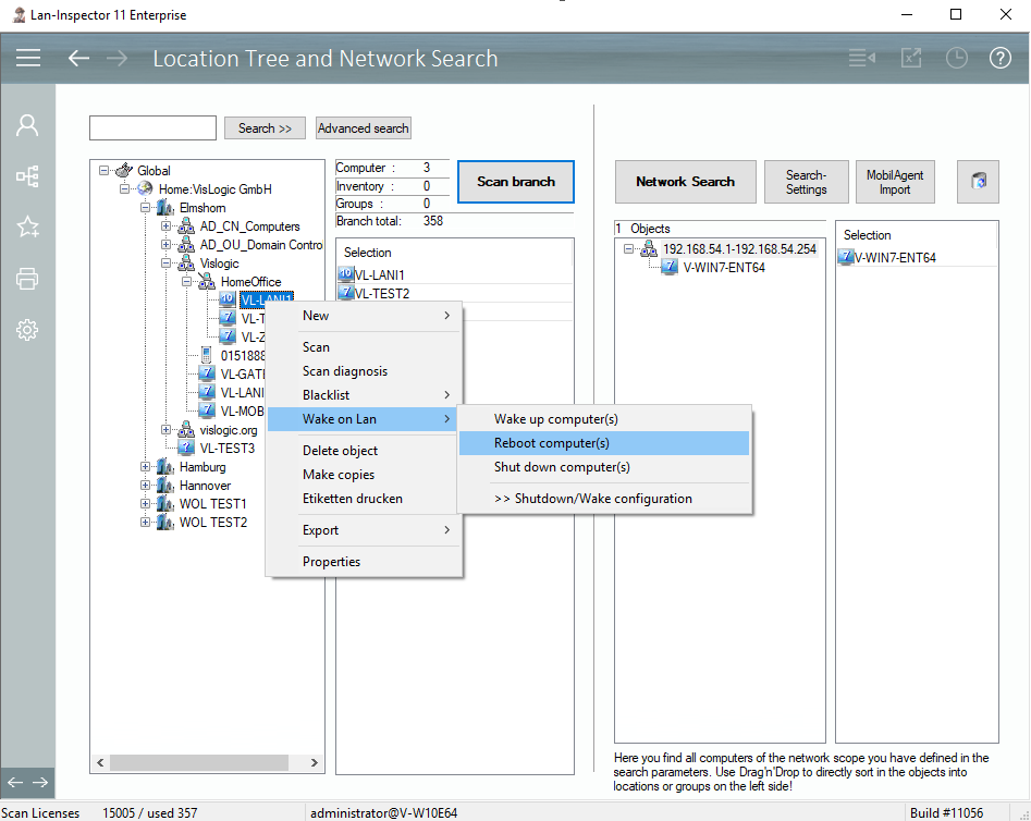 Lan-Inspector provides comprehensive functions for remote booting, shutting down, and restarting your machines. Use the context menu of the location tree by right clicking groups or single computers and selecting the corresponding function. The Wake-on-Lan configuration determines the way this context menu function works. You find it in the dropdown function menu under Settings, or just by calling it using the context menus.