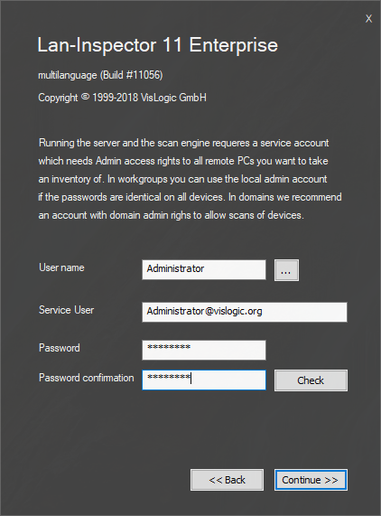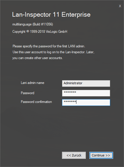 The installation of this edition differs from the Basic and Professional editions only in one point. As the Enterprise one uses a multi-user client/server architecture, you provide a master password for accessing the Lan-inspector framework. The setup function calls it simply “Administrator” which cannot be changed. Choose the password you enter when you want to access the Lan-Inspector Framework. You can also leave it blank.