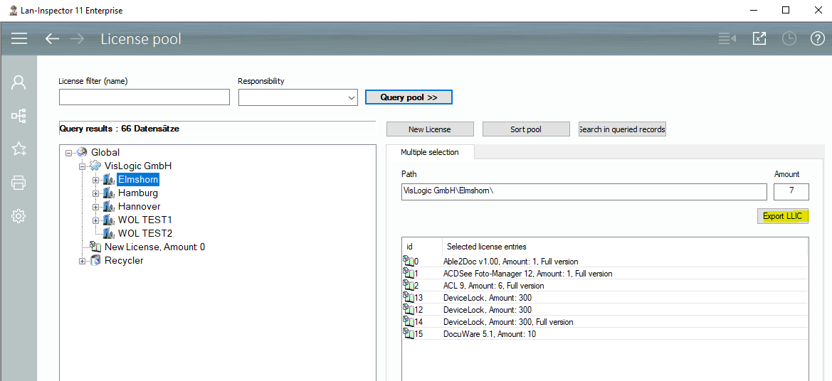 Visit the license pool and query your license record sets, see 6.5.1 License Pool / License Entry | “License+Software Management/License Pool“). Click on a group to receive the list of its license children on the right.