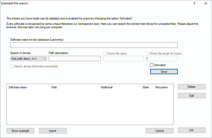 In analogy to the extended registry search, you can specify files as a marker for a software on the remote computers. If the file exists on the hard disc the named software product will be added to the scan record of that computer.