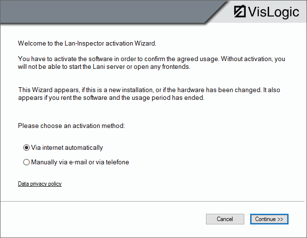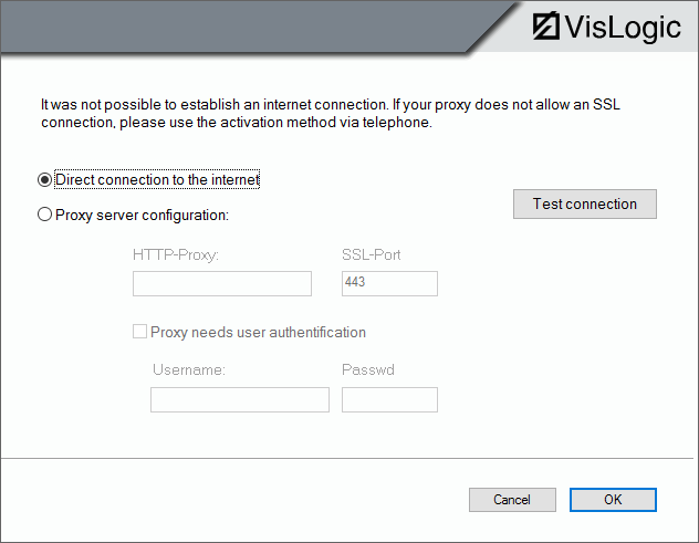 3. If you continue the activation process will take place if an internet connection is available. If not, a dialog will pop up, asking for proxy parameters.