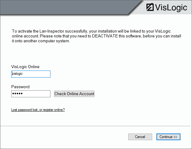 2. Provide your VisLogic account name and password (see 4.1.2 Full Version requires Activation Process). You can also click on the link “lost password or register online” and follow the instructions on the web site.
