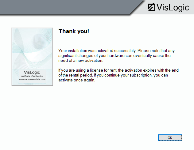 5. After the codes have been accepted, you’ll receive a confirmation dialog. If your hardware changes significantly, the product has to be activated again.