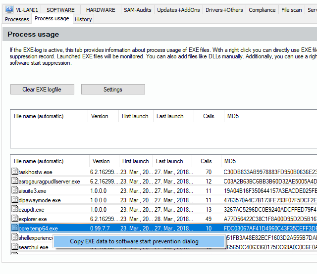 Use the right mouse button on an entry in the list of Exe files in the Process Usage tab to call up a context menu. You can use the collected data about the chosen executable file to generate an entry in the software start suppression (Software Blacklist/Whitelist).