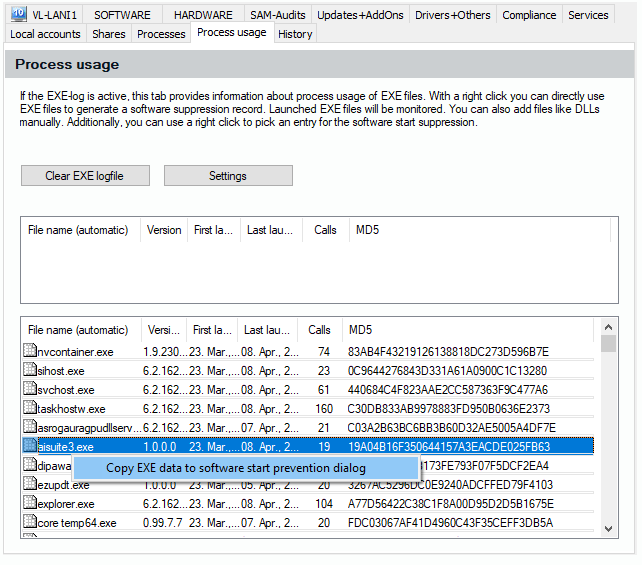 To register a manual Exe via the function of the Exe protocol, visit the view “Object Details” and select the tab dialog “Process Usage”, see 6.3.6 | ”Inventory Management/Object Details“. In case your exe protocol is active, you will see a list of exe files the user has started on the client. You can use the right mouse button to call up a context menu which allows you to take information about an exe to the software start prevention config. To enable the exe protocol (see 6.4.12), visit “Inventory Management/More/EXE protocol“. You can also click on “Settings“ in the process usage tab dialog, see 6.3.6.12.