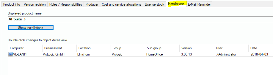 The sheet with the header “Installations“ will show you all PCs that have an installation of this software. For performance reasons the list will not be calculated automatically, because it can take some time, especially if you have many computers. Click on “Show installations“ in order to retrieve the list.