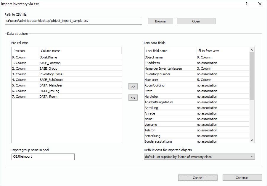 The list contains all inventory classes you have defined before. If you leave the settings on “default – or supplied by ‘Name of inventory Class’”, your csv file needs to have a column containing the name of the inventory class. When an object is imported from the line of your csv file, the name of its inventory class is taken from that column. If the class has not been defined in the data base, a corresponding class entry will be added automatically.