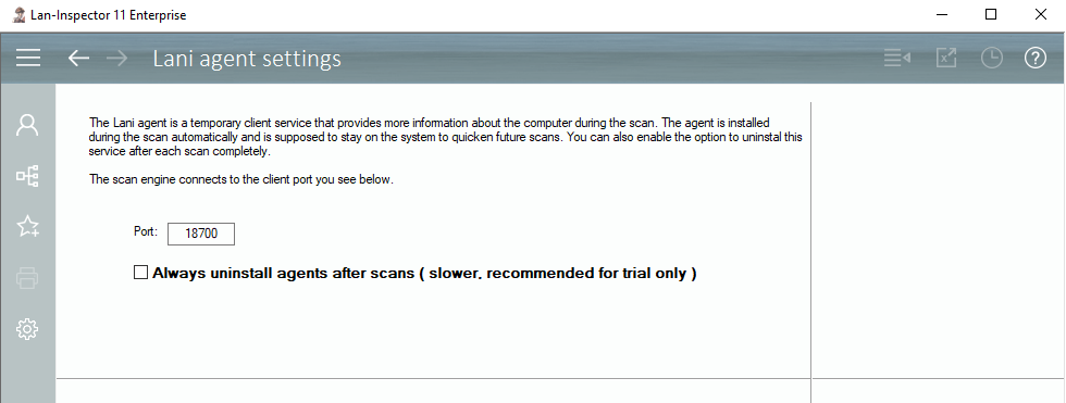 This menu branch opens the view of lani agent settings which is – at the moment – only, that you can choose whether the agent is supposed to be uninstalled after each scan.