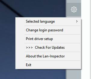 Here you can select the language of your GUI or change its appearance. Furthermore, you can change your password, setup your printer driver or look for an update of the Lan-Inspector. You can also display information about the product or close the GUI by choosing “exit” if you don’t want to use the corner’s X.