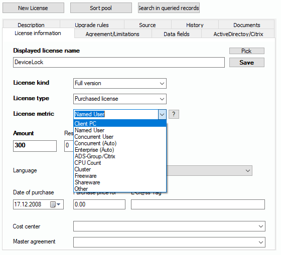 License metrics dominate the jungle of licenses. Every software producer is free to modify agreements and licenses at his own will. The most common metric is “Client PC”. The Lan-Inspector creates a license balance by confronting the number of installations with the number of allowed clients in the purchased license. There are various other models. Usually common software producers include methods that limit the usage of their products technically. However, the Lan-Inspector offers various possibilities to map license metrics into a license data entry, see 6.5.1 License Pool / License Entry: