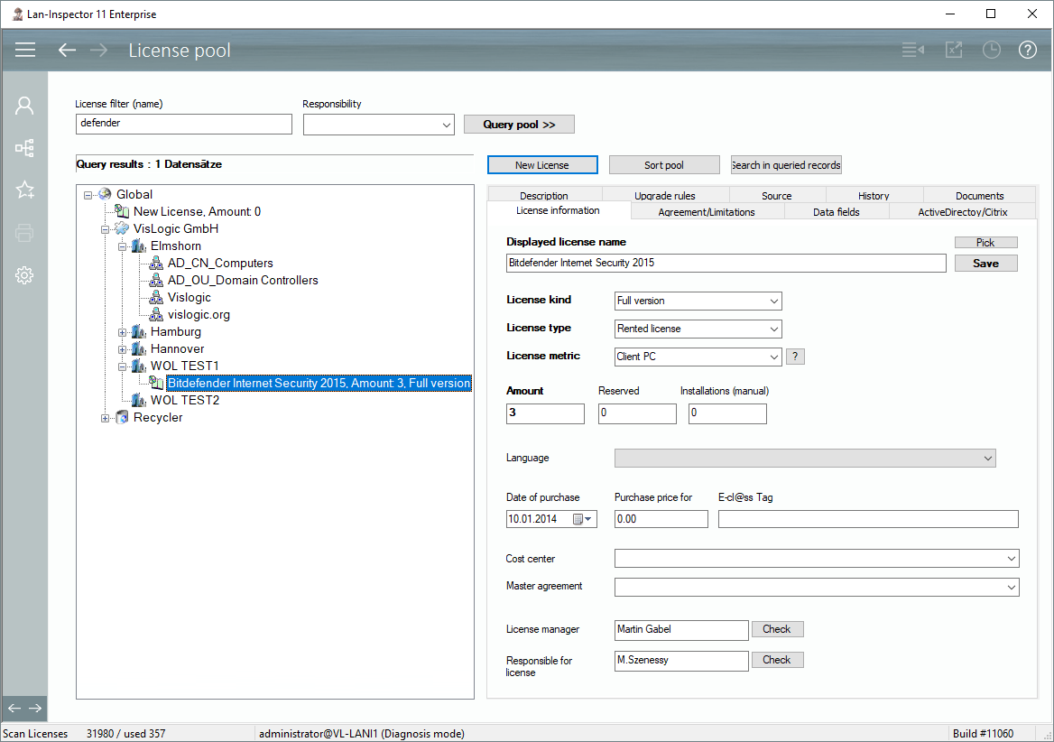 This is the main page for entering the name and the basic properties, such as count, reserved and manual installations. Count refers to the number of licensed devices (metric “Client PC”). However, you can also use “Count” in other metrics. “Reserved” means that the Lan-Inspector will subtract a manually entered reserve from the existing licenses before comparing count with stock. This field applies for Citrix Terminal server Support described below. “Manual installations” allows you to provide an installation count that is not available via network scans.