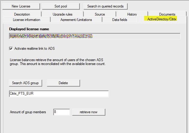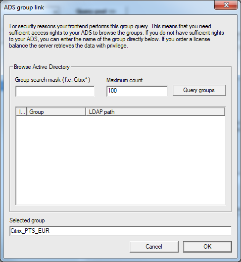 If the Lan-Inspector has sufficient access rights (scan engine user account, see 4.2.2.2 Enterprise Edition), it can import information from the Active Directory Services. There are many Citrix solutions that license users who are members of a specific ADS group. The Lan-Inspector can count the members of a specific group and use this number in the license record in “reserved” if the license record is activated for the ADS link. If this link is active, the Lan-Inspector will count the number of the ADS group before every license balance is calculated.
