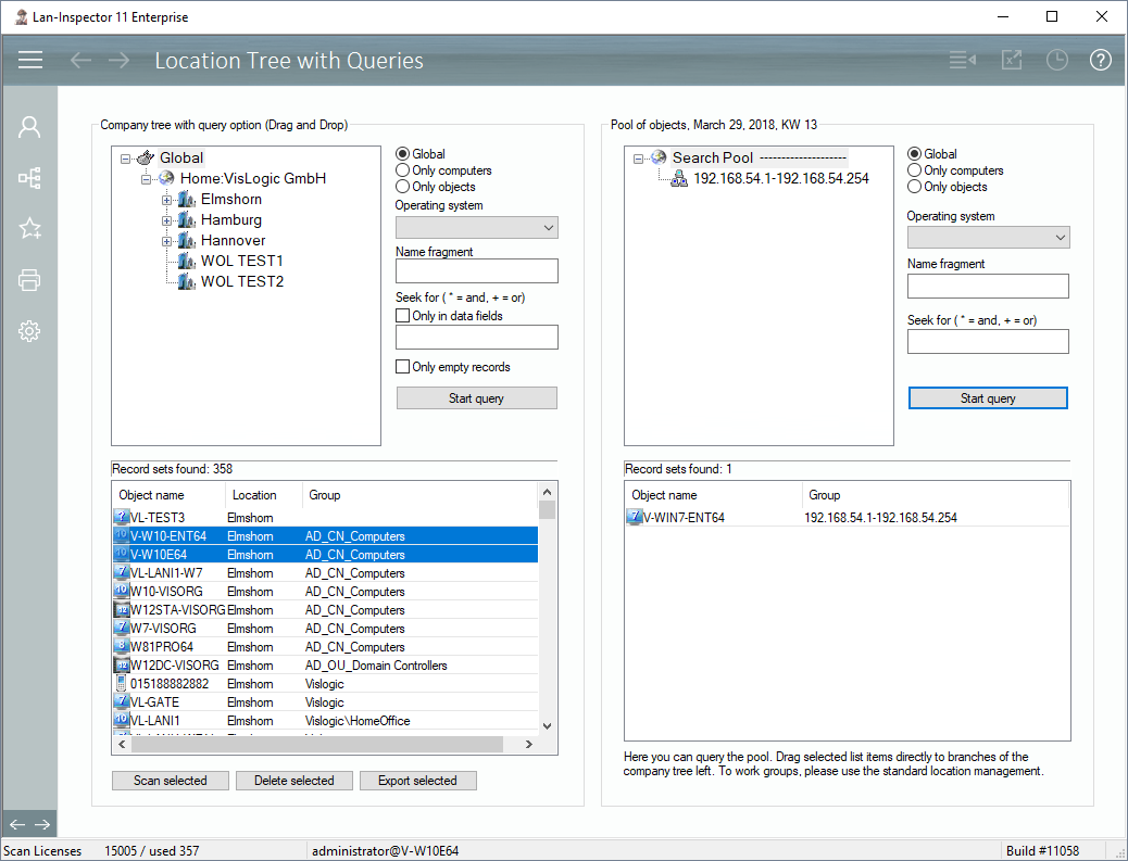 (Enterprise Edition only) This dialog is about large, heterogeneous networks. To assign the machines to the location tree in a meaningful manner, you need the support of queries. For instance, you can search for IPs or name fragments or perform a full text search for content within the computer data sets. If you import computers from third party systems for example, where departments have already been associated with data fields, you can perform queries on the existing departments here and will get a selection list of all corresponding machines. You can then move those easily to the target group. Query capabilities are also available in the computer pool. Within large networks with many IP ranges, where computers are associated sporadically; this can be very helpful for moving all the computers to the location tree.