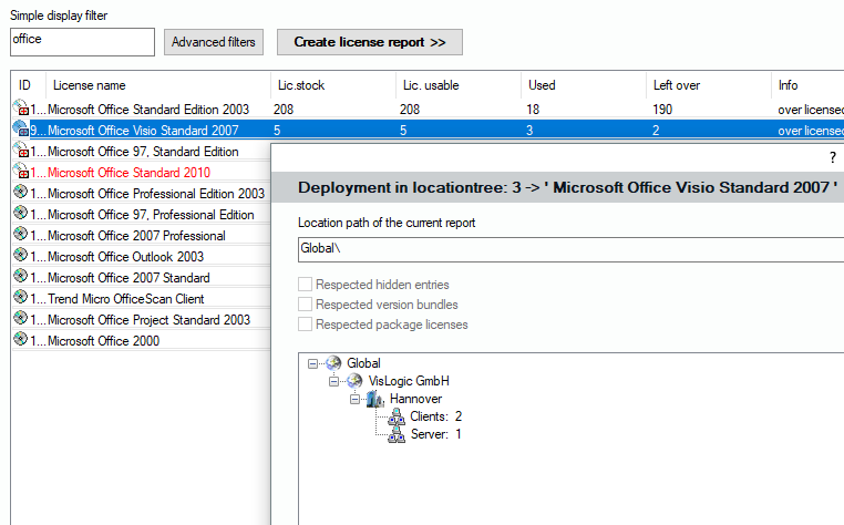 If you have some time, you can add a calculation of installation deployment for all positions in the license balance. When the calculation is finished, you can switch each line by clicking the “ + “ at the left side. The line will unfold and display the deployment in groups.