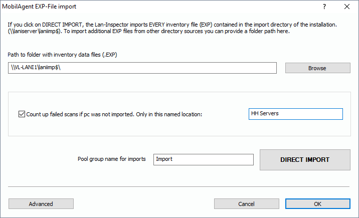 If you haven’t installed to the standard folder, the path is correspondingly different. The Laniimp$ share is created during the setup process automatically. The share grants write-Access to “everyone” on the network. EXP files use a secure cryptography algorithm to make sure no one can read or spy on them. These credentials are needed if you configure “Scan on Logon”, see also 6.9.3 Scan on Logon / Script Generator | „Menü: Administration and Settings/Scan on Logon“.