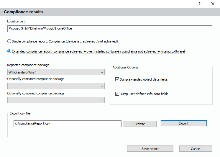 You can combine three different compliance packages you have defined before. The report will show you a detailed apportionment of achieved compliance packages and those that failed for the PCs. If you select the advanced report, the report also contains information about missing software products causing the compliance package to fail, and information about all software that is installed on the computer without being in any compliance package.