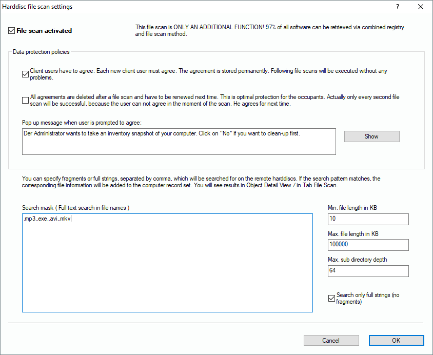 A very impacting function to refine the inventory data base of your network is the partition file scanner. You specify a search pattern and all files on the remote hard discs that match this pattern will be scanned, information about them will be collected and saved to the data base. Afterwards the information can also be accessed via the full text search of “Search & Scan”. You can use this functions to collect information about mp3 files or lost doc files in your network.