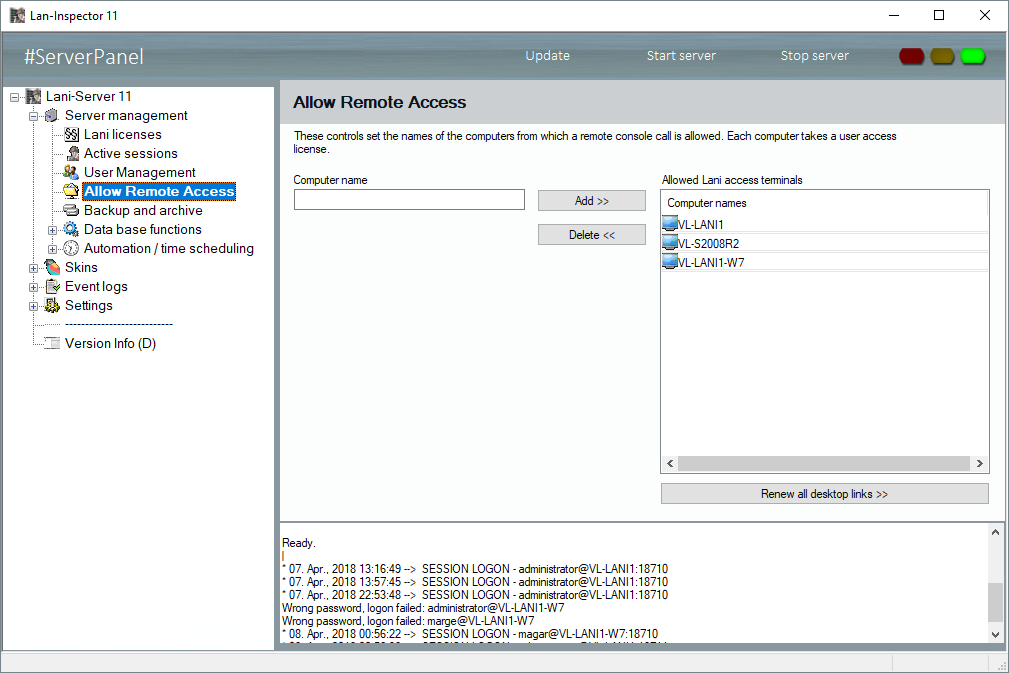 In order to access the Lan-Inspector server from your usual workstation, you have to assign a remote access permission to your workstation on the server. Each persistent access of a workstation consumes a Lan-Inspector access license.