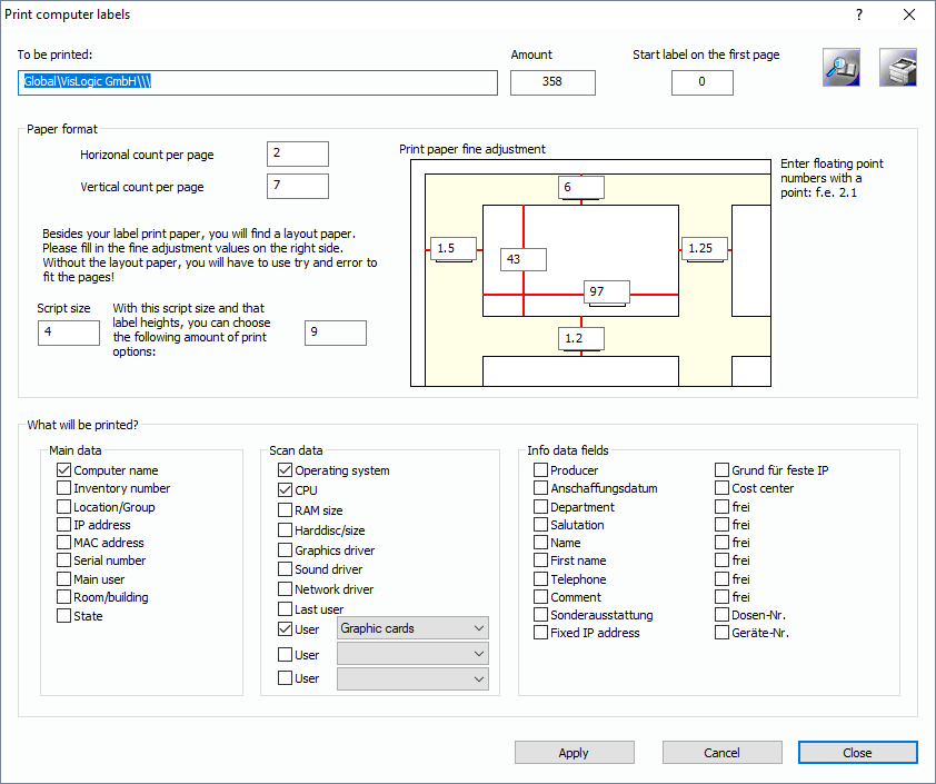This function helps you print individual labels for computers based on their inventory record set. Depending on the sheet size you want to use, you can customize the format adequately. The sheet sizes you are using can be arbitrarily defined.