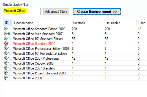 You can use the simple display filter in order to focus on the products of a special producer like Microsoft. The result may look like the one in the picture. If you need individual reports like balances of products with a special responsible person, use the button „Advanced filters”.