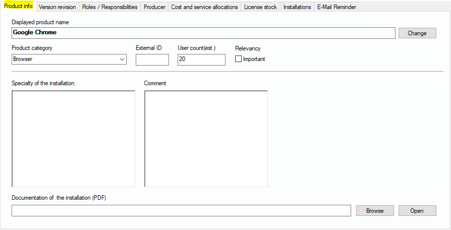 This sheet is supposed to contain miscellaneous information about the product. You can set the “important“-tag here, which will make queries more easy later. “Product category“ is a drop-down list where you can select an existing category, or you just enter a new one which will be also available for other product records then. Furthermore, you can describe any problems or exceptions that have to be cared about during the installation or just comment the product.
