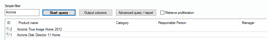 Enter a name fragment into the field below “simple filter” and click on “start query”. All managed products that match the pattern will be queried and displayed in your list. You can also use the logical operators known from other queries like /and/ /or/ and /not/. This can help show products of one or more producers. If you don’t use the filter and just click on “Start query“, all existing records on the server will be displayed in your list.