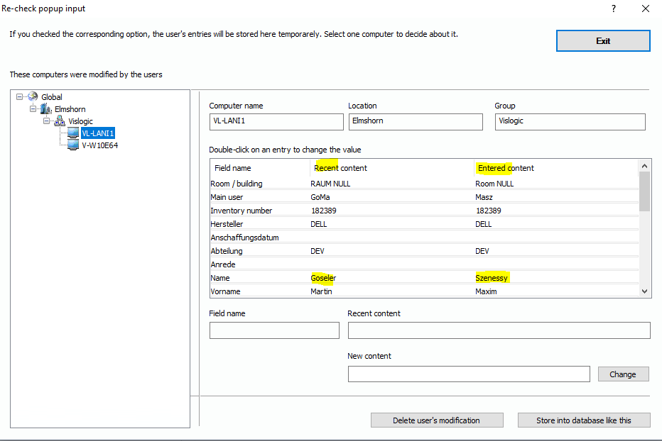 On the left side, you see the location tree which lists all computers with cached user entries. Click on one computer object. On the right side, you will see the object’s content of the data base and next to it, you see the entries the users have made.