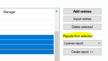 If you need a report of the license balance which is narrowed to specified products from your list, select the records of interest, choose “License report” from the drop-down list and press “Create report >>”. This switches to the license balance view and starts to calculate your report, see also 6.5.2 License Balance | „License+Software Management/License balance“.