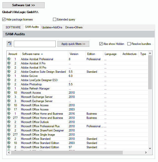 This list contains all products that need your attention concerning SAM audits. At the moment the filters are only available for Adobe and Microsoft products. Of course, we cannot guarantee that the filters map all products, but if you stumble across strange or wrong entries, please let us know.