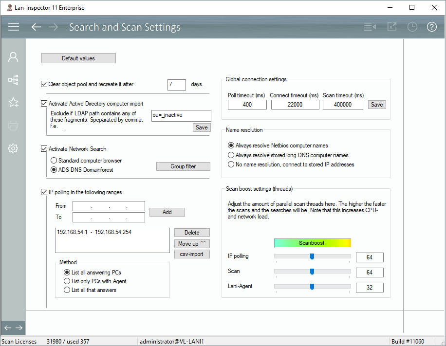 All computers found in one of these ways will be collected in the pool of unassociated computers, see 6.3.1 Location Tree and Network Search or “Inventory Management/Location tree and Network Search”. You can decide if the Lan-Inspector fills the pool incrementally without expiry, of if you want to erase it at specified intervals in order to build it up with newly found computers. This can avoid hosting very old computers that possibly don’t exist anymore.
