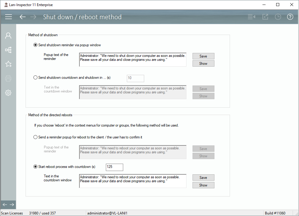 In the view “Location Tree and Network search”, you can call up the WOL functions by right-clicking a group of the tree and using the context menu. For shutdown as well as for reboot, you can use a reminder window or one with a countdown.