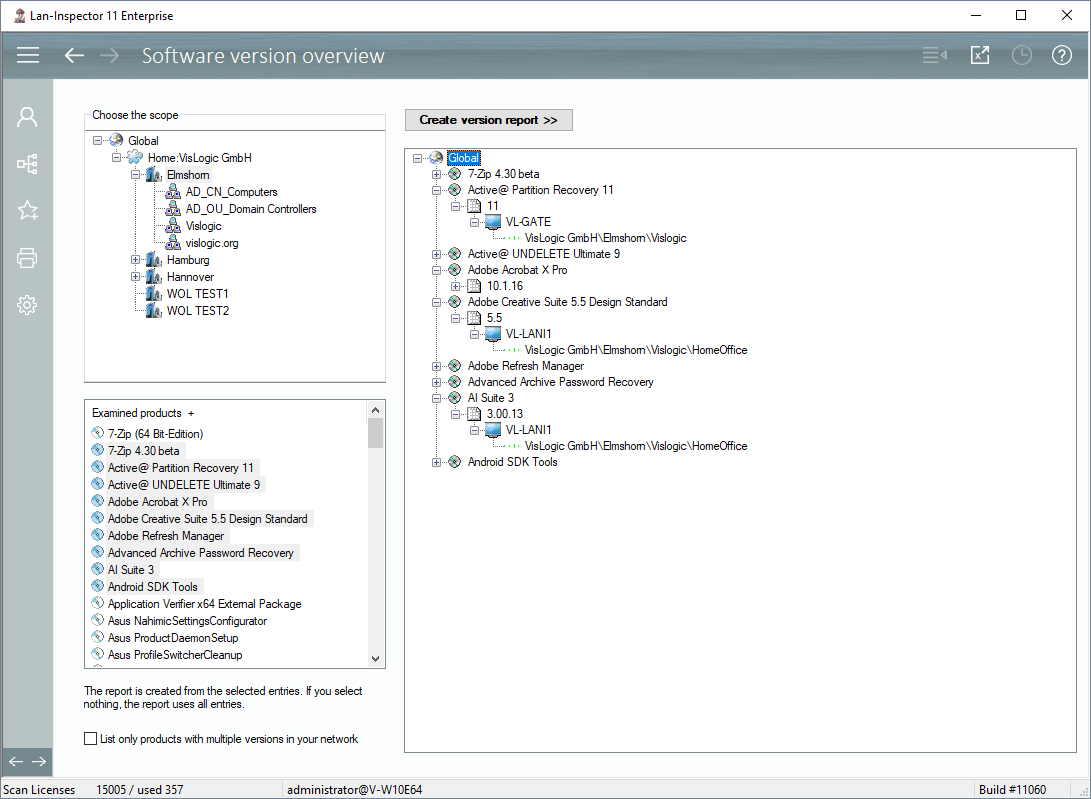 This function helps you resolve installations with perspective on their version. Just select the scope of your query within the tree of locations. Afterwards (multi-)select the products of interest in the list below. Now click on “Create version report >>”.