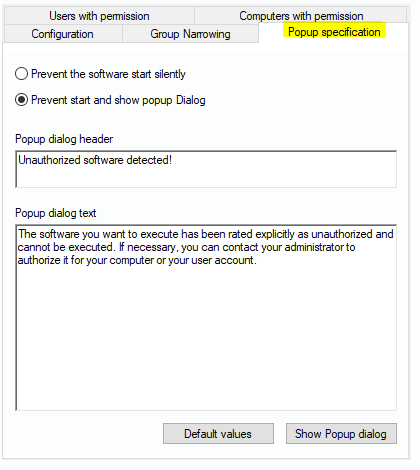 The tab dialog “Popup specification“ lets you specify how software starts matching the corresponding record set will be prevented on the client. You can define an own header and a self-written text that will be displayed in a friendly box if the user starts the corresponding software product.