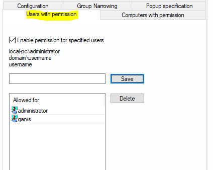 This tab dialog helps you set a list of (domain-) accounts that are not affected by this record set. Enter the account name and click on “Save”. You can also select an entry and remove it by clicking “Delete”.