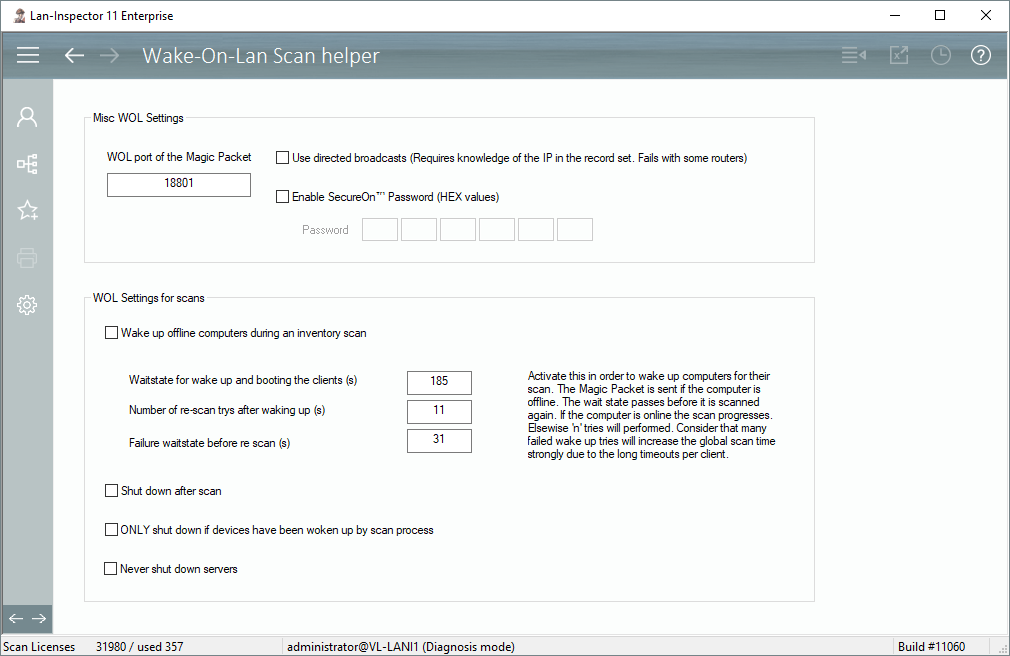 Please note, long timeouts and multiple tries to wake up a computer in order to scan it, are quite time consuming. If the wake-up procedure fails, the timeouts run through completely.